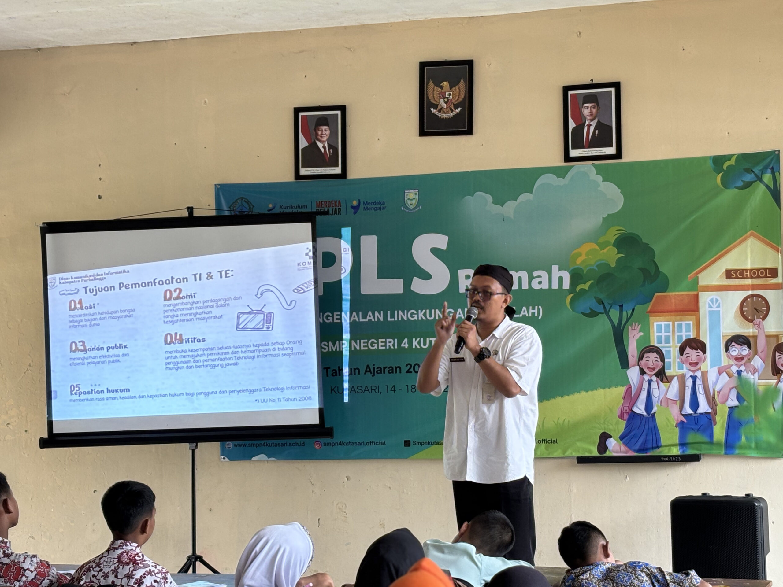Kegiatan Masa Pengenalan Lingkungan Sekolah SMP Negeri 4 Kutasari menghadirkan narasumber dari Dinas Komunikasi dan Informatika Kabupaten Purbalingga. Pembekalan mengenai Literasi Digital dengan tema “Bijak dalam Bermedia Digital” yang bertujuan untuk membentuk karakter siswa yang cerdas, kritis, dan bertanggung jawab dalam menggunakan media digital. Rabu (16/07/2025).