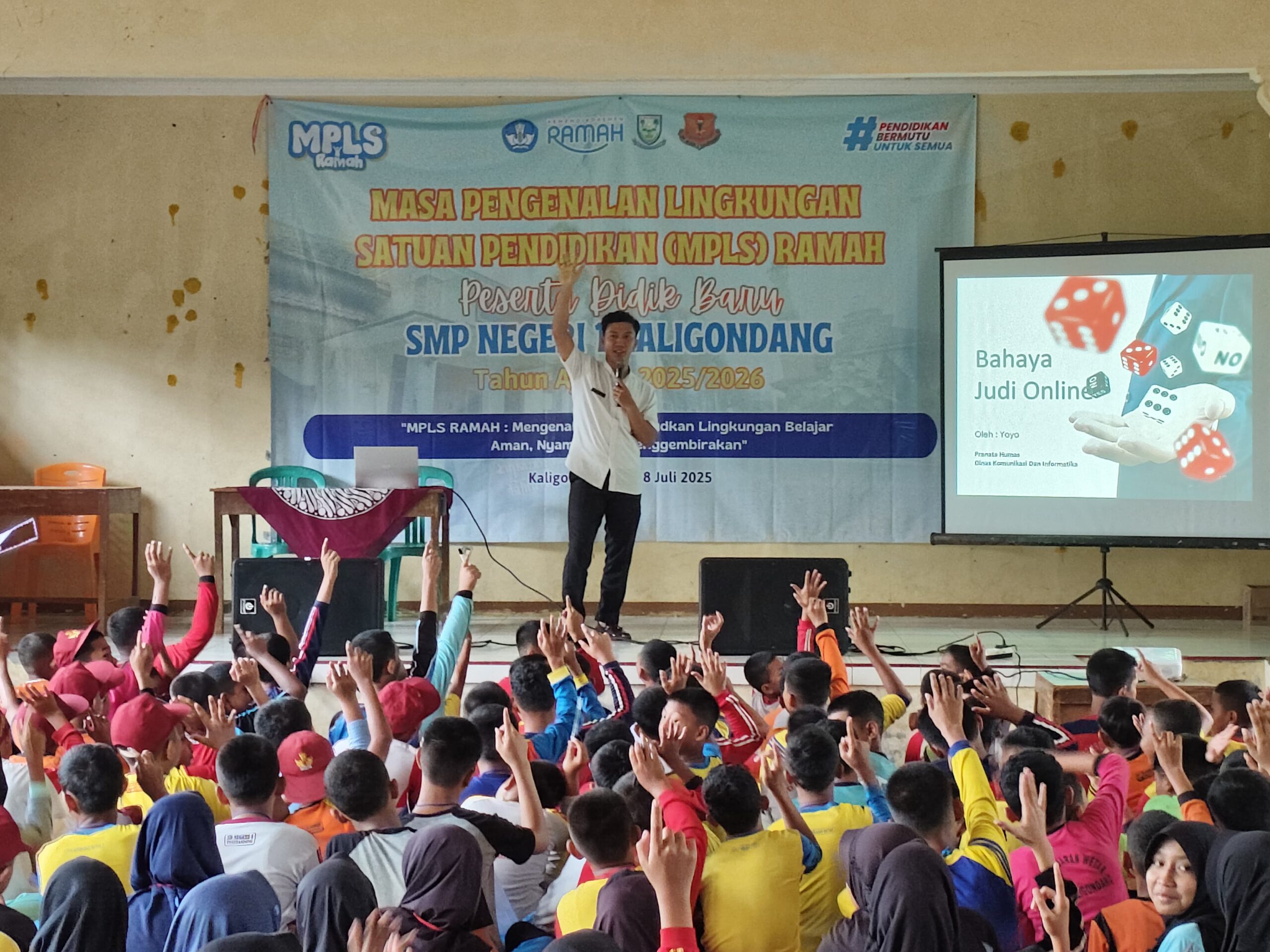 Kegiatan Masa Pengenalan Lingkungan Sekolah (MPLS) di SMP Negeri 1 Kaligondang menghadirkan narasumber dari Dinas Komunikasi dan Informatika. Pada kesempatan tersebut, narasumber menyampaikan materi bertajuk “Sosialisasi Pencegahan Isu Judi Online” sebagai upaya edukasi dini kepada siswa mengenai bahaya dan dampak negatif dari praktik perjudian daring. Rabu (16/07/2025).