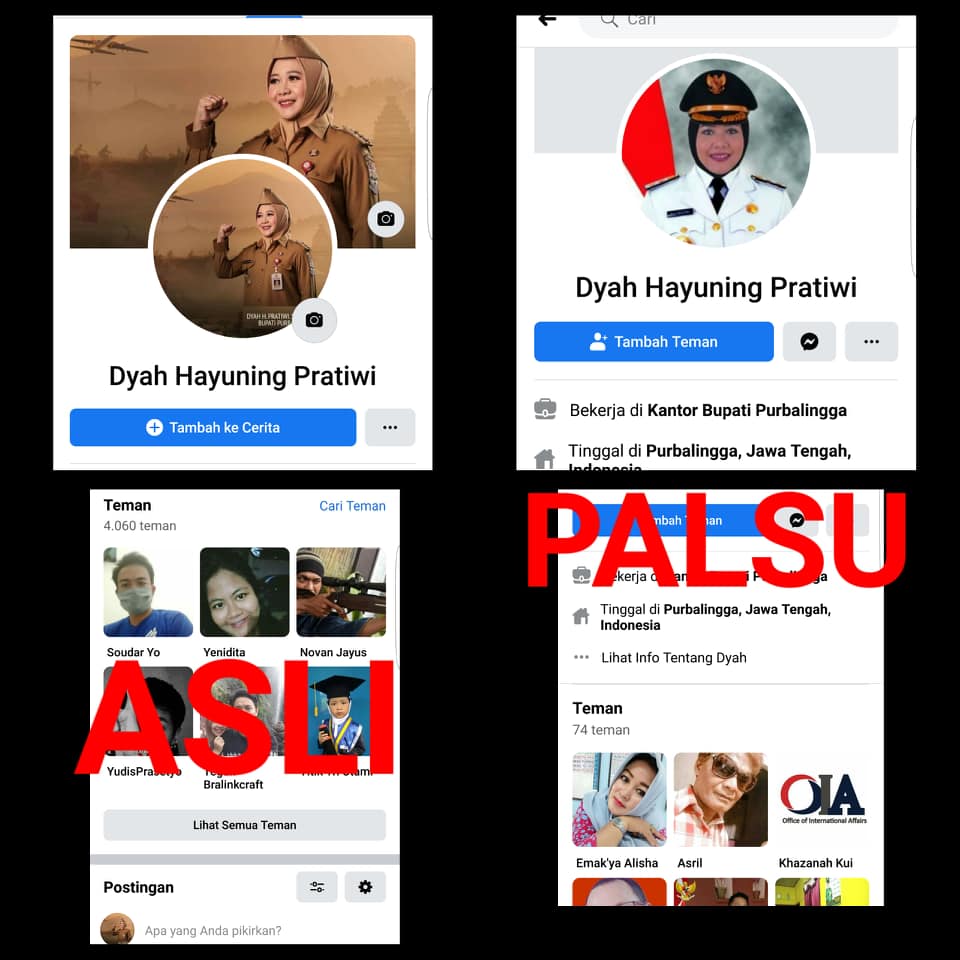 “Masyarakat jangan percaya begitu saja apabila ada akun facebook atau akun medsos yang lain mengatasnamakan Bupati Purbalingga, akun resmi dapat dilihat langsung dari profil dan juga postingan beliau di facebook,” jelasnya.