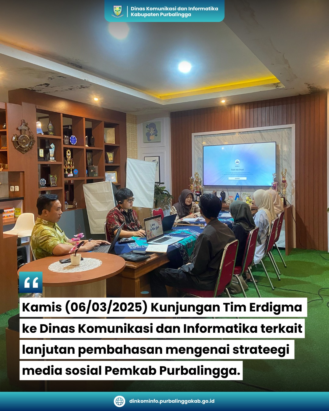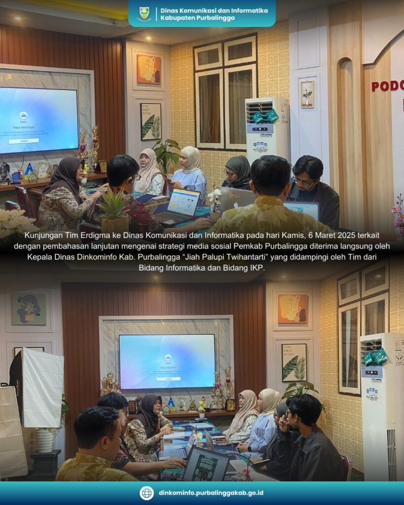 DINKOMINFOKunjungan Tim Erdigma ke Dinas Komunikasi dan Informatika terkait dengan pembahasan lanjutan mengenai strategi media sosial Pemkab Purbalingga admin9 months ago9 months ago01 mins Kamis (06/03/2025) Kunjungan Tim Erdigma ke Dinas Komunikasi dan Informatika terkait dengan pembahasan lanjutan mengenai strategi media sosial Pemkab Purbalingga. Post navigation Previous: Acara Ramah Tamah Bupati dan Wakil Bupati PurbalinggaNext: Maklumat Pelayanan Dinas Komunikasi dan Informatika Kabupaten Purbalingga Leave a Reply Cancel replyYour email address will not be published. Required fields are marked *Comment * Name * Email * Website Save my name, email, and website in this browser for the next time I comment. Δ